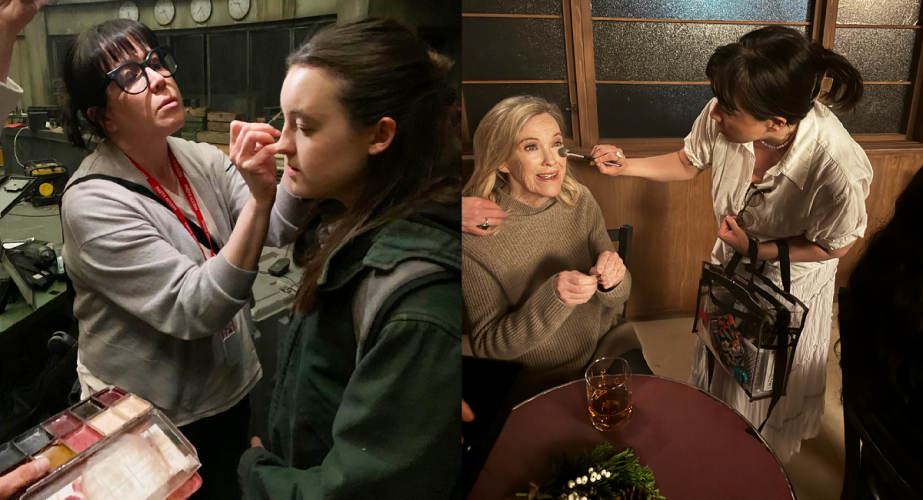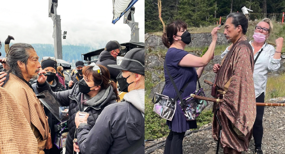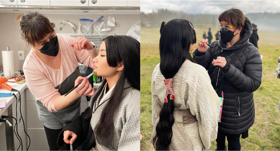 Rebecca Lee doing makeup touch ups on actor Hiroyuki Sanada (above) and actress Anna Sawai (below) on location in BC during filming for ‘Shōgun’.